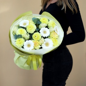 Букет "Лимонный" из георгин, диантусов, роз, гербер и эвкалипта