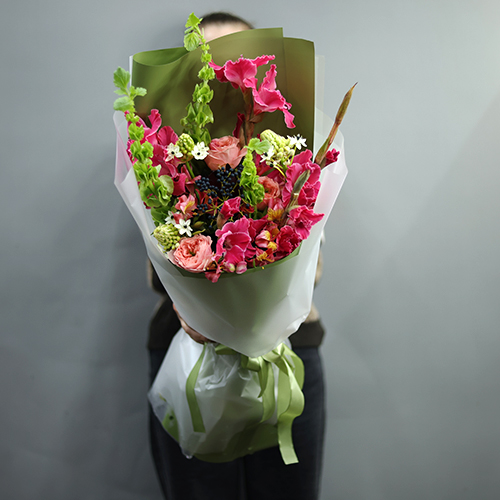 Букет "Карнавал" из гладиолусов, орнитогалума, альстромерий, пионовидных роз, вибирнума и молюцеллы