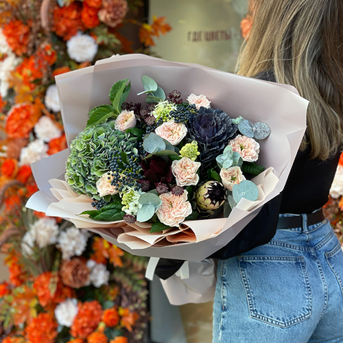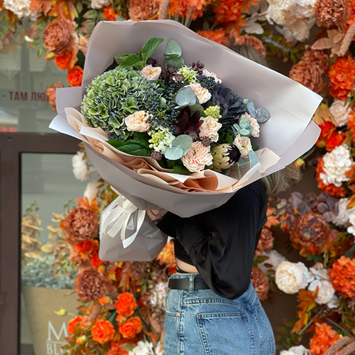 Букет "Ночь нежна" из Голландской гортензии, ягод вибирнума, сафари, махровых роз, протеи, брассики и орнитогалума