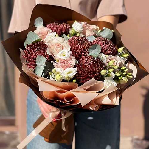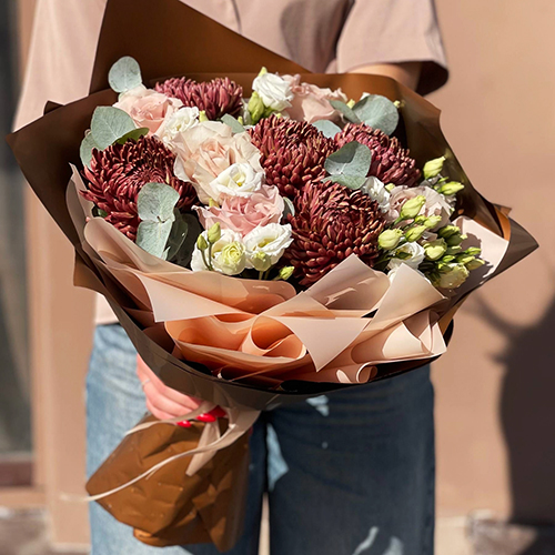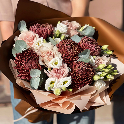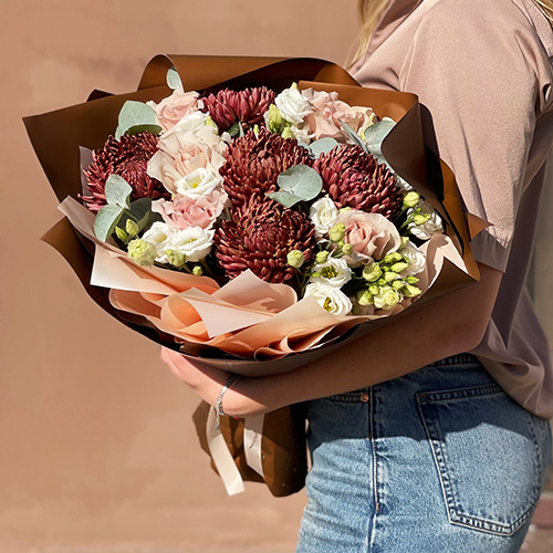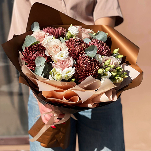 Букет "Шоколадка" из хризантем Бигоуди, роз Эквадор Квиксенд и эустом