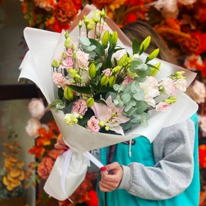 Букет "Моё лето" из ароматных пионовидных лилий и махровых эустом