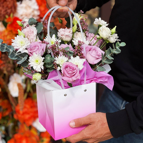 Стильная композиция в сумочке из роз, хризантем и эустом